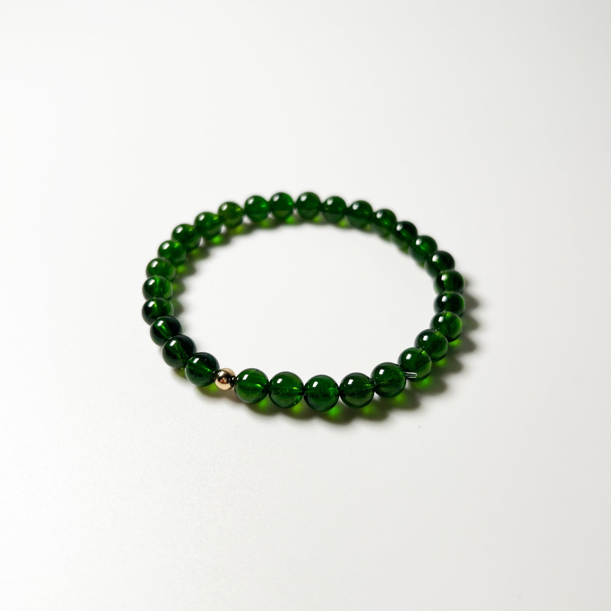 A single pure 18K solid gold bead adds a luxurious focal point, enhancing diopside’s vibrant green hues with warmth, refinement, and timeless beauty.
